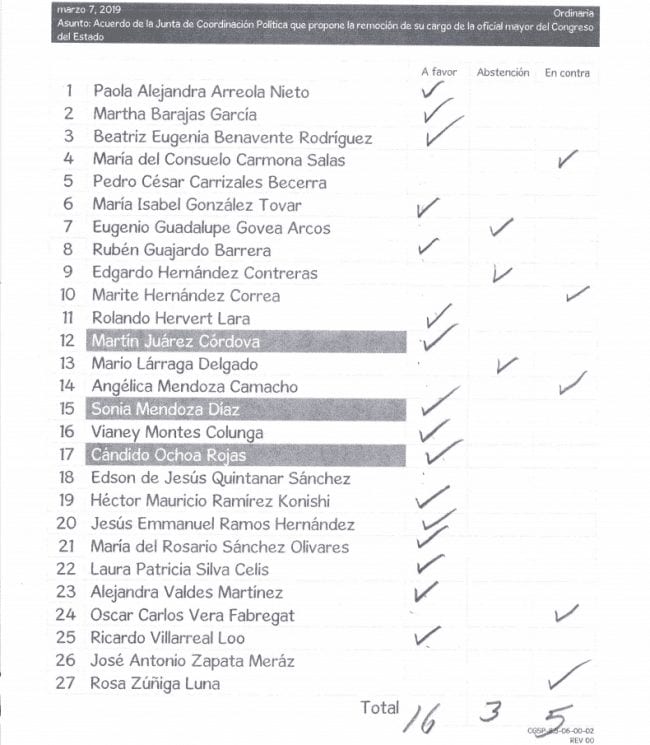 A favor de la expulsión de la morenista Oviedo Oviedo, votaron sus compañeras Paola Arreola y Alejandra Valdés Martínez junto a la fracción tanto del PAN y PRI con excepción de José Antonio Zapata Meraz que no asistió a la sesión.